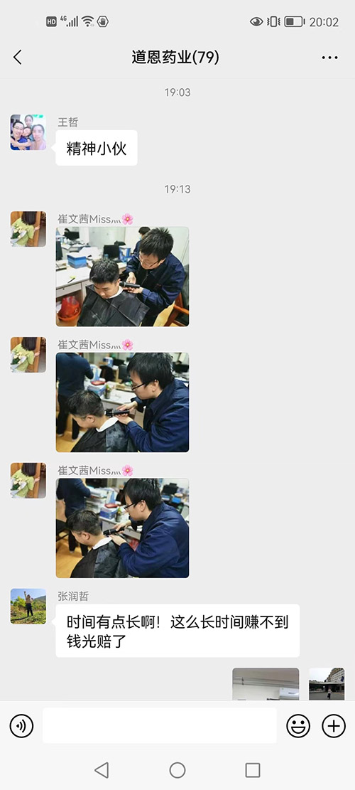 這兩天道恩藥業(yè)工作群里被一段段理發(fā)的視頻和搞笑的評論刷屏了。視頻里的“理發(fā)師”是道恩藥業(yè)生產(chǎn)總監(jiān)王學智,他拿著電動推子全神貫注為員工理發(fā),每一下都十分認真,不放過任何一個細節(jié);被理發(fā)的“頹廢少年”秒變“精神小伙”;圍觀群眾打趣到:“服務這么長時間卻賺不到錢,光賠了。”理發(fā)現(xiàn)場的氣氛十分融洽,隔著屏幕都能讓我們感受到那份歡快。