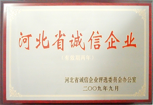 2009年9月,我公司被河北省誠(chéng)信企業(yè)評(píng)選委員會(huì)評(píng)為“河北省誠(chéng)信企業(yè)”,并被收入《河北誠(chéng)信企業(yè)建設(shè)成果集》。證書(shū)及獎(jiǎng)牌于近日發(fā)放到公司。