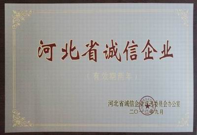 2012年9月26日上午,在河北省石家莊市召開(kāi)了2012年“河北省企業(yè)誠(chéng)信建設(shè)經(jīng)驗(yàn)交流會(huì)”暨“河北省誠(chéng)信企業(yè)”授牌儀式。我公司被評(píng)為2012年“河北省誠(chéng)信企業(yè)”,公司董事長(zhǎng)、總經(jīng)理王振剛被評(píng)為“河北省企業(yè)誠(chéng)信建設(shè)優(yōu)秀工作者”。河北省整頓和規(guī)范市場(chǎng)經(jīng)濟(jì)秩序領(lǐng)導(dǎo)小組辦公室、河北省誠(chéng)信企業(yè)評(píng)選委員辦公室、河北省企業(yè)家協(xié)會(huì)聯(lián)合對(duì)獲獎(jiǎng)企業(yè)予以表彰,并頒發(fā)了證書(shū)。誠(chéng)信是企業(yè)生存的根本,誠(chéng)信是企業(yè)發(fā)展的法寶。