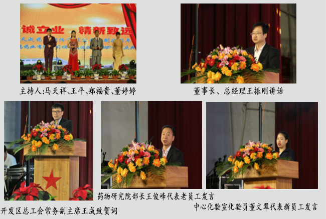 <節目名稱按圖片排列順序>1.藥物研究院詩朗誦《走向復興 走向輝煌》2.開發區總工會副主席商忠瑞深情朗誦3.開發區總工會常務副主席王成傾情演唱《多情的土地》4.公司領導班子合唱《我們走在大路上》5.儲運部合唱《明天會更好》