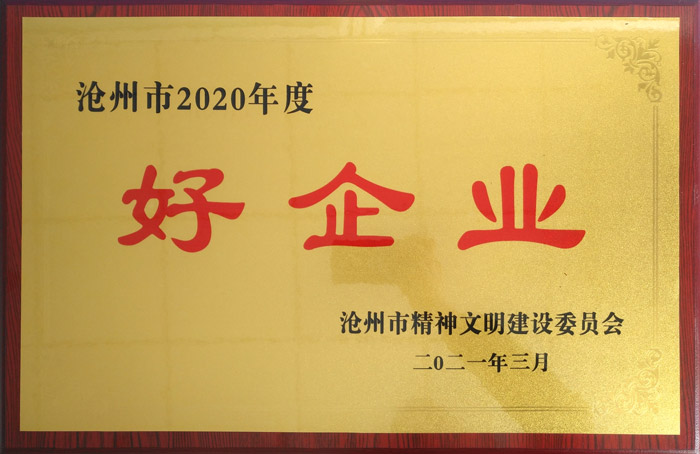 3月15日,我公司被滄州市精神文明建設委員會評為滄州市2020年度“好企業”榮譽稱號。