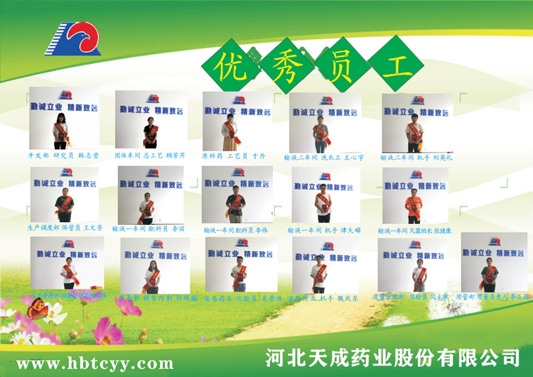 | 7 | 張健康 | 輸液一車間 | 滅菌班長 | 他踏實肯干,服從領導安排,積極工作,主動帶新人,在組成的新班驗證階段起到了模范帶頭作用。 | |